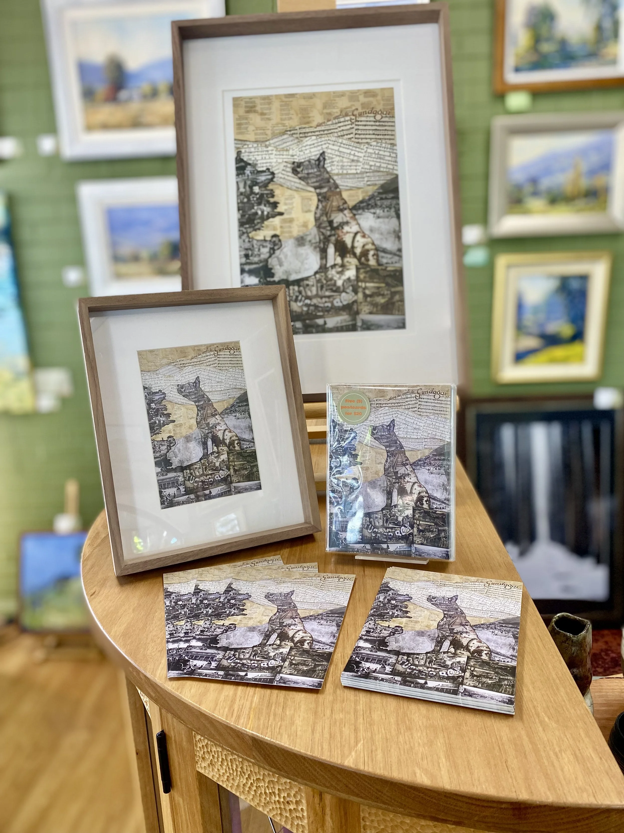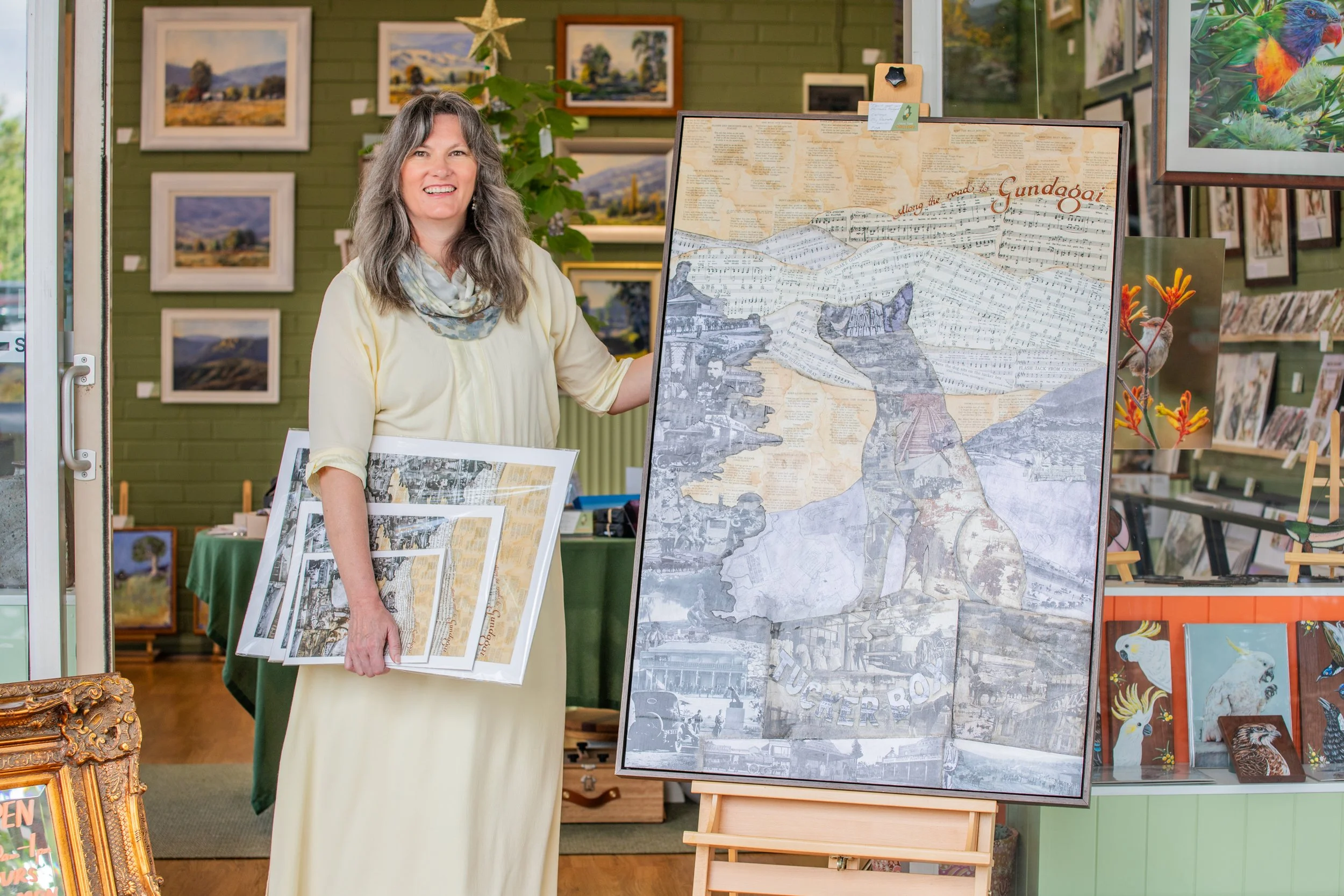 Rechelle is a collage artist and finds this medium produces artworks that are a great conversation piece to have in the gallery. She has completed works on Ned Kelly titled ‘The Unpardoned’ and the Dog on the Tuckerbox aptly named ‘Don’t Get Your Bullocks Bogged!’ Currently on her working easel at the moment is a life sized collage of Ned Kelly. Miles Franklin collage materials are being collected for her next in line project.